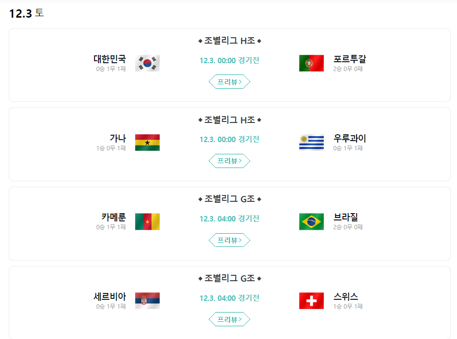 대한민국대 포르투갈 전은 12월 3일 자정에 열립니다.